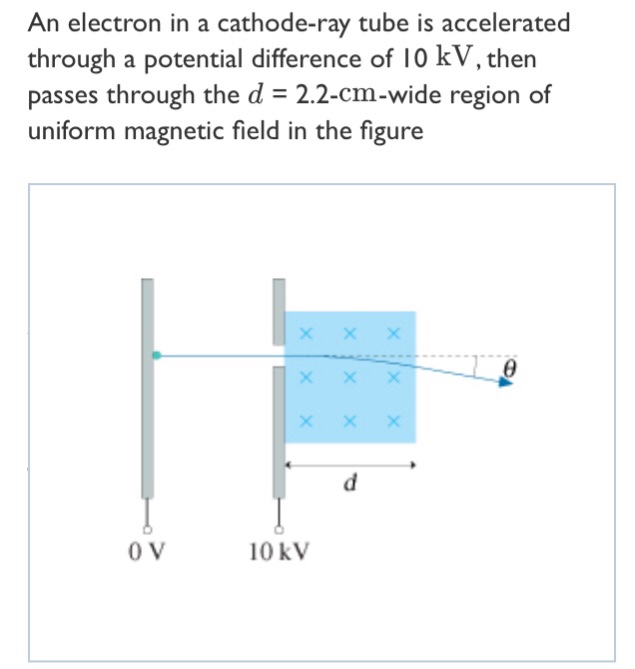Part A An electron in a cathode-ray tube is accelerated through a potential difference of 10 kV then passes through the d 24-cm-wide region of uniform magnetic field in the figure Figure 1. An electron in a cathode-ray tube is accelerated through a potential difference of 10 kV then passes through the d 23-cm-wide region of uniform magnetic field in the figure. Then it passes through a region of transverse magnetic field where it moves in a circular arc with radius 0180 m.
